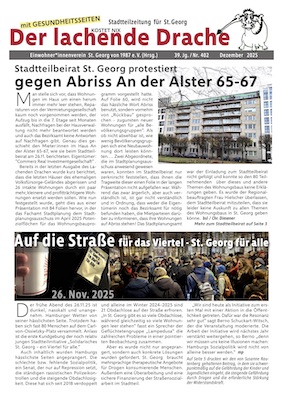 Als St. Georger*innen können wir ganze Arien davon singen, was diese Strategie mit den Betroffenen und unserem Stadtteil macht. Denn hier erleben wir in der jüngsten Vergangenheit – parallel zu den Verdrängungsmaßnahmen am Hauptbahnhof – ein spürbares Anwachsen der Zahl der Obdachlosen und eine ebenso deutliche Zunahme ihrer Verelendung. Verdrängung löst keine Probleme sondern verlagert und verschärft sie nur!